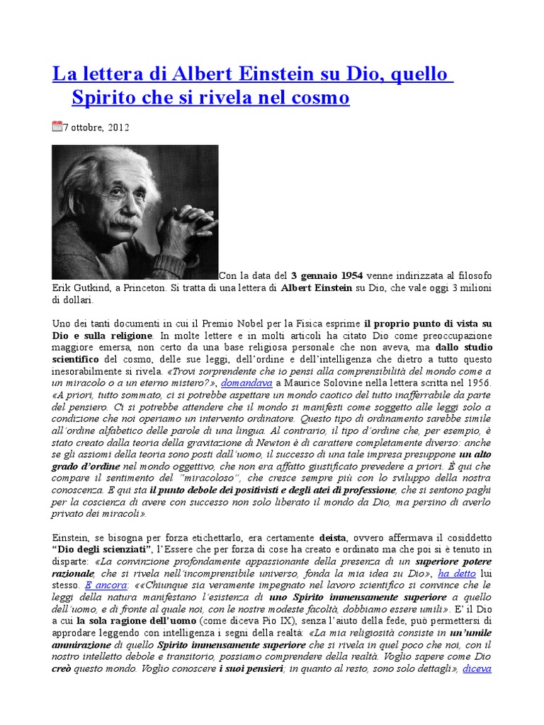Lettera su dio einstein testo integrale pdf. 1/ La lettera di Einstein sull'ebraismo e su Dio. Testo integrale 2 Testo integrale. Riprendiamo dal blog di Massimo Schuster la sua traduzione della famosa lettera del 1954 di Albert Einstein a Eric Gutkind, filosofo ebreo ... EINSTEIN : “LETTERA SU DIO” - Giuseppemerlino's Blog 6 Dec 2018 — “Non voglio e non posso figurarmi un individuo che sopravviva alla sua morte corporale: quante anime deboli, per paura e per egoismo ridicolo, ... La lettera di Albert Einstein su Dio, «prodotto della debolezza ... 5 Dec 2018 — La lettera contiene la parola “Dio” solo una volta, ma è considerata un documento storico importante perché contribuisce a chiarire la posizione ... DIO ESISTE? RISPONDE ALBERT EINSTEIN Il professore rispose: “Se Dio ha creato tutto quello che esiste, Dio ha fatto anche il male, visto che esiste il male! E se stabiliamo che le nostre azioni ...
